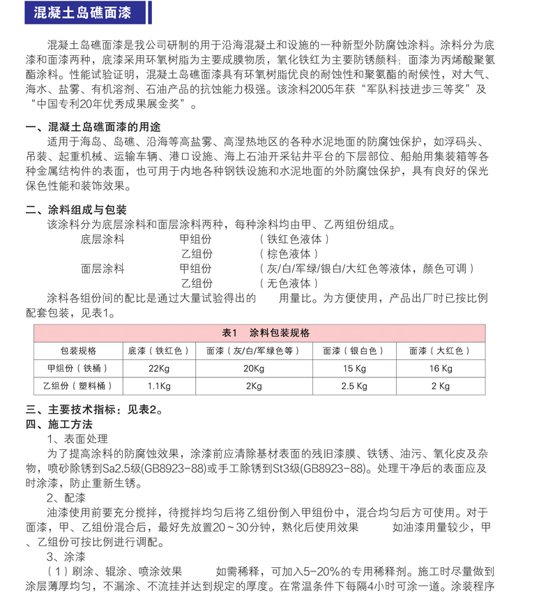 適用于海島、島礁、沿海等高鹽霧、高濕熱地區(qū)的各種水泥地面的防腐蝕保護,如浮碼頭、吊裝、起重機械、運輸車輛、港口設(shè)施、海上石油開采鉆井平臺的下層部位、船舶用集裝箱等各種金屬結(jié)構(gòu)件的表面。