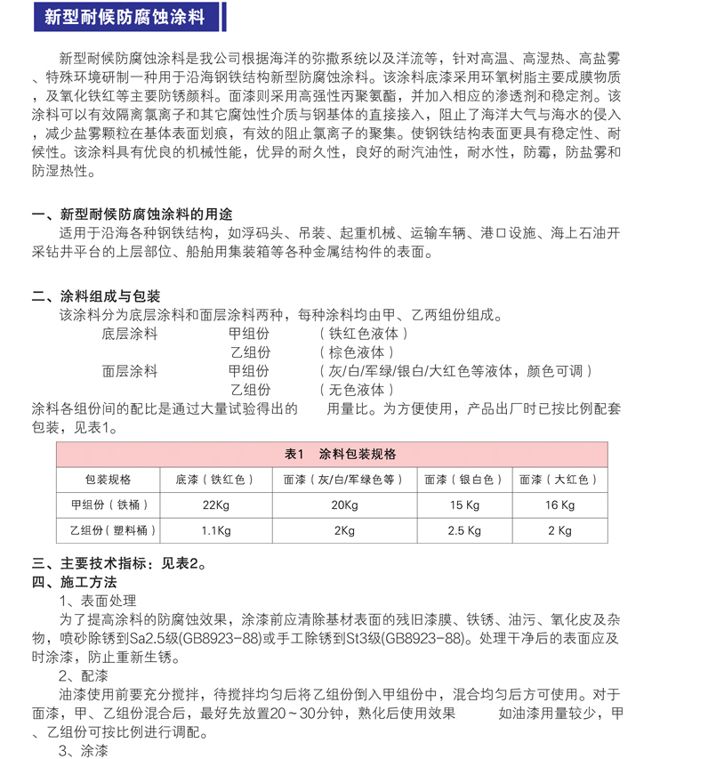 適用于沿海各種鋼鐵結(jié)構(gòu),如浮碼頭、吊裝、起重機(jī)械、運(yùn)輸車輛、港口設(shè)施、海上石油開采鉆井平臺的上層部位、船舶用集裝箱等各種金屬結(jié)構(gòu)件的表面。