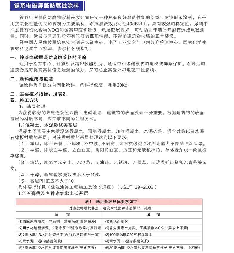 適用于指揮中心、計(jì)算機(jī)及精密儀器機(jī)房、通信中心等建筑物的電磁波屏蔽保護(hù)。涂刷后的建筑物既可提高其抗信息泄漏的能力,又可防止其受外界電磁干擾影響。