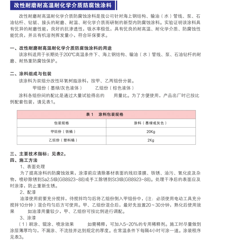 該涂料適用于長(zhǎng)期處于200℃高溫條件下、海上鋼結(jié)構(gòu)、輸油(水)管線、泵、石油鉆桿的耐磨、耐熱重防腐蝕保護(hù)。