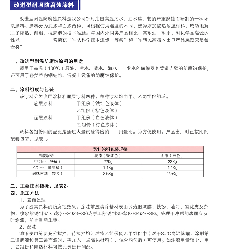 產品分類:油罐內壁、管內壁用防腐蝕涂料、各種鋼結構用防腐蝕涂料、化工用防腐蝕涂料、特種防腐蝕涂料